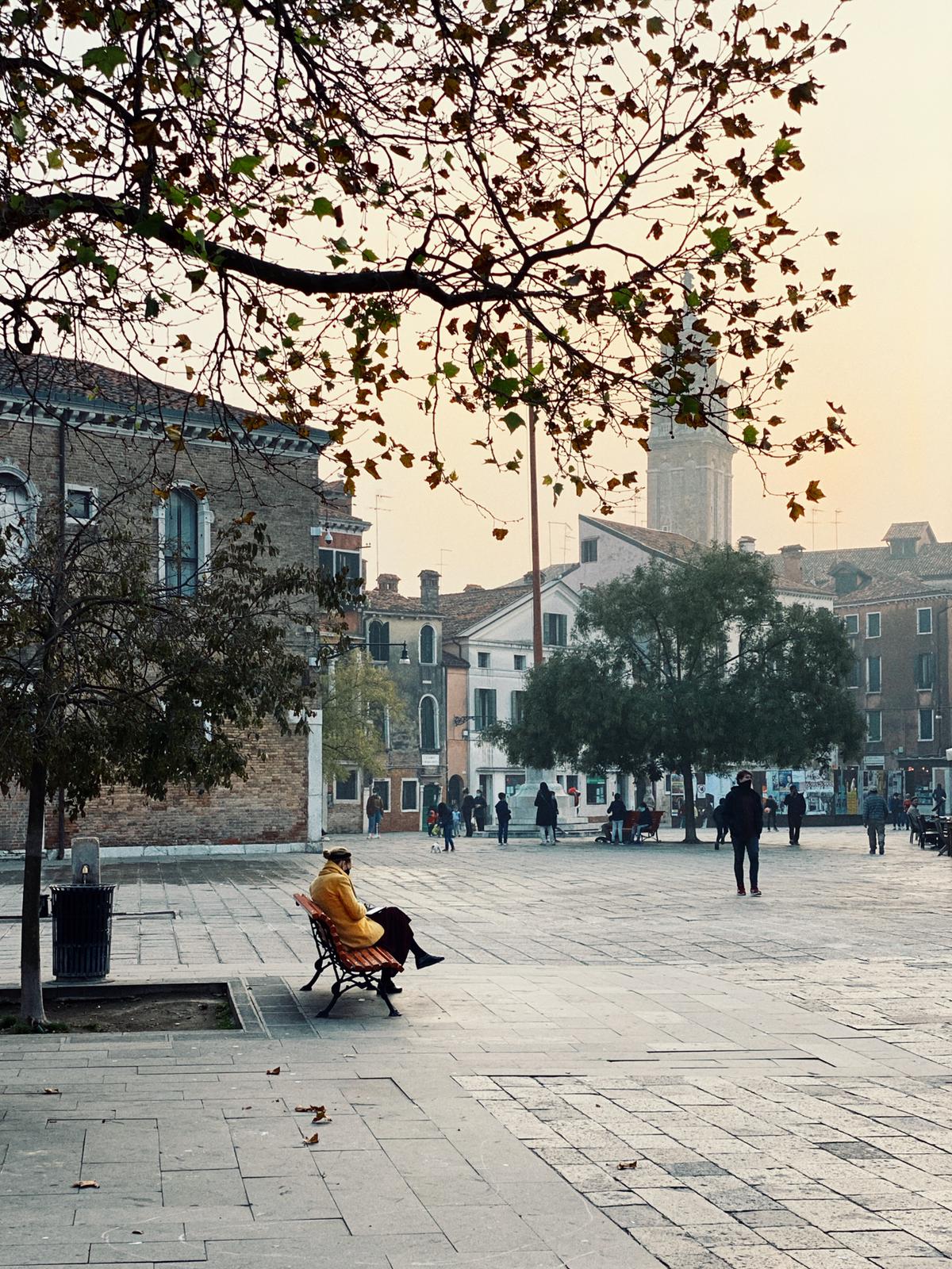 After a short walk, she found herself at Campo Santa Margherita. She looked around for an empty place and under one of the trees she took a seat on an empty bench, fastened her scarf and jacket, chose a suitable music for reading and got her book out. She had the bench for herself for a while, as she enjoyed both the book and the view. She saw people passing by. There was the old woman dragging her shopping cart careless about the surrounding that seems to be boring usual view for her, followed by a couple astonished by every single thing they see around, fetching their camera trying to capture every sight, and there is a mother on the other side running after her son. Over there a bit further, the fish market stands out and people were gathered around to buy the best of it, and on the other benches people sat enjoying their fresh hot pizza slices. The Campo was busy, where all the places and restaurants tables out were full with people.